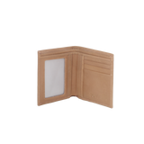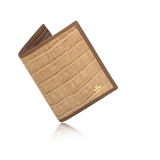 Crafted from genuine leather, this bi-fold wallet stands out with a khaki croc-embossed exterior framed in smooth brown leather. The interior, finished in matching khaki, includes 4 card slots, 2 slip pockets, 1 ID window, and a full-length bill compartment for organized storage. |