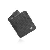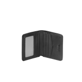 Sophisticated vertical wallet in black genuine leather with a woven-texture exterior. Features 4 card slots, 1 transparent ID window, and 1 bill compartment for everyday essentials.