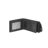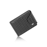 Black genuine leather wallet with textured woven pattern and secure flap closure. Includes 3 card slots, 1 transparent ID window, and 1 bill compartment. |