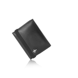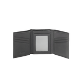 Sleek black genuine leather tri-fold wallet with a subtle textured trim and secure strap closure. The black interior includes 6 card slots, 2 slip pockets, and 1 full-length bill compartment, offering organized storage in a compact design. |