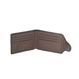 Black genuine leather wallet with secure flap closure and brown interior. Features 8 card slots, 2 bill compartments, dedicated slots for SD or SIM cards, and extra pockets for organized storage. |