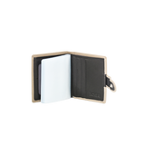 Stylish grey genuine leather wallet with secure snap closure. Features multiple card slots, a removable card holder insert, and a two-tone interior for added elegance. |